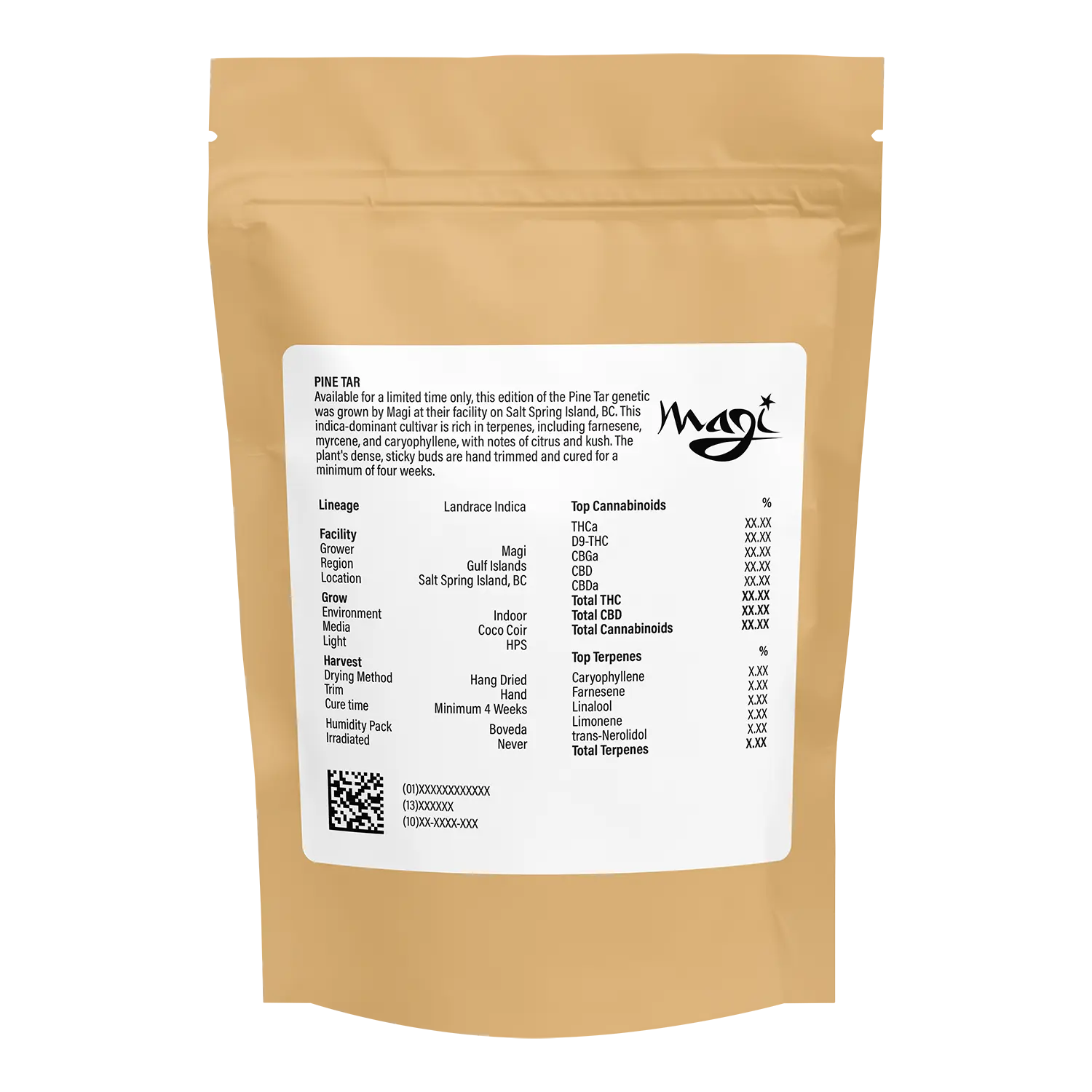 Available for a limited time only, this edition of the Pine Tar genetic was grown by Magi at their facility on Salt Spring Island, BC. This indica-dominant cultivar is rich in terpenes, including farnesene, myrcene, and caryophyllene, with notes of citrus and kush. The plant's dense, sticky buds are hand trimmed and cured for a minimum of four weeks.