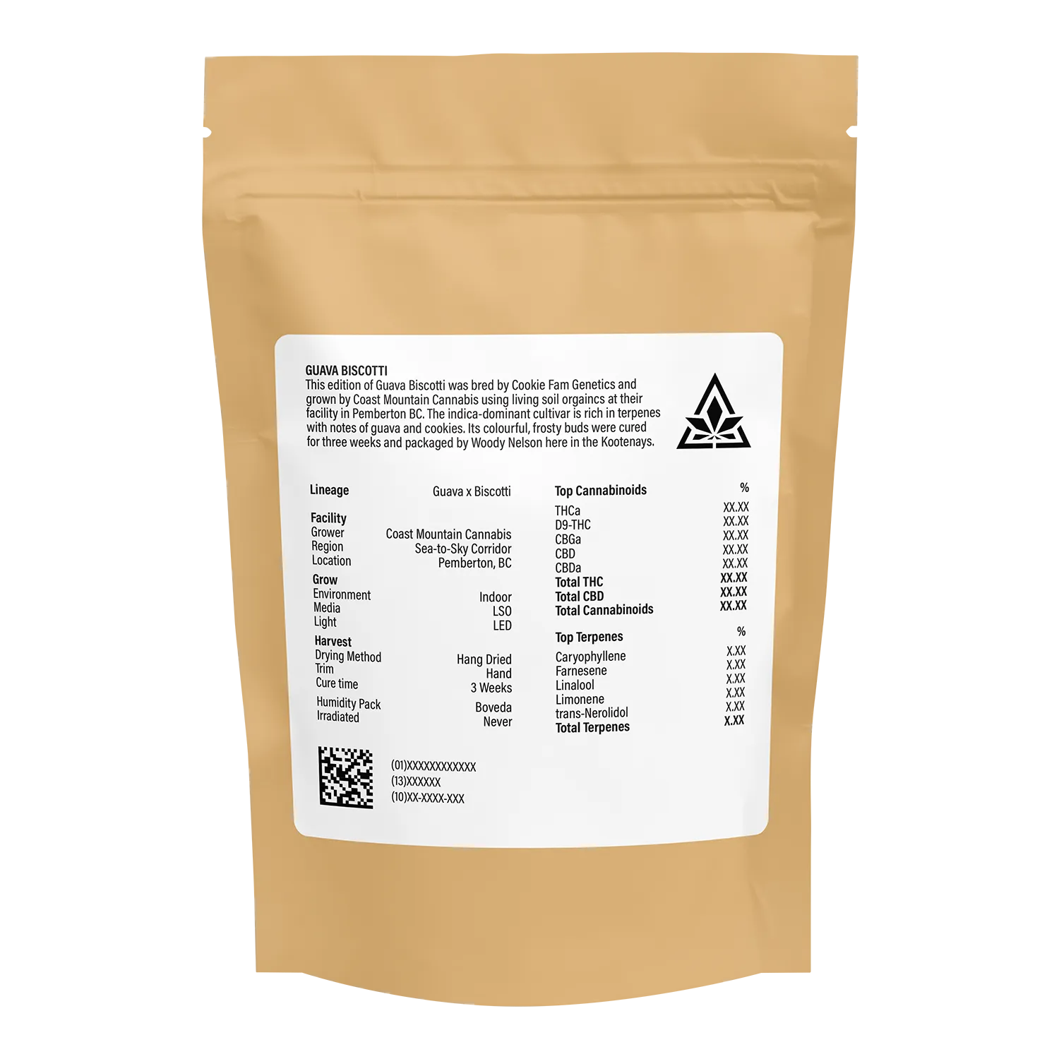 This edition of Guava Biscotti was bred by Cookie Fam Genetics and grown by Coast Mountain Cannabis using living soil orgaincs at their facility in Pemberton BC. The indica-dominant cultivar is rich in terpenes with notes of guava and cookies. Its colourful, frosty buds were cured for three weeks and packaged by Woody Nelson here in the Kootenays.